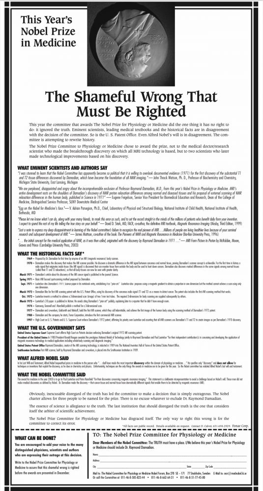 可见ChatGPT的说明:“广告标题:《必须纠正的可耻错误》(The Shameful Wrong That Must Be Righted)背景简介:这则广告由 FONAR公司 于 2003年 10月在《纽约时报》上刊登,强烈抗议诺贝尔奖委员会将当年的诺贝尔生理学或医学奖授予了两位科学家——保罗·劳特伯(Paul Lauterbur)和彼得·曼斯菲尔德爵士(Sir Peter Mansfield),而忽略了美国医生雷蒙德·达马迪安(Raymond Damadian) 在核磁共振成像(MRI)发明中的贡献。达马迪安是最早提出用核磁共振来诊断癌症的人,并于1977年制造了第一个人体MRI扫描仪。但诺奖最终只授予了另外两位科学家,认为他们在成像技术上的数学和物理改进更具决定性意义。