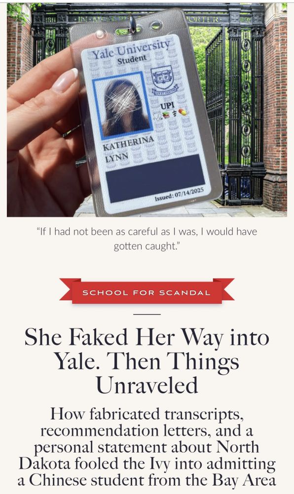 耶鲁招生办还有脸发布这个声明,这应该属于他们工作的重大失误。他们面试过Katherina Lynn?对她的白人背景和人生经历没有怀疑?耶鲁也是太相信人了,这种情况与高中辅导员的一个电话就会被识破。