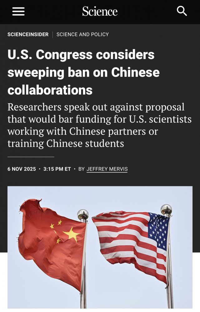 因为美国与俄罗斯、伊朗和朝鲜这些邪恶轴心国的合作有限,条款扩展到中国令人震惊,中国也需要问自己为什么落到了与美国公开的敌国结盟的境地。《科学》杂志已就此专门撰文表示担忧,如果最终通过,几乎将彻底切断中美之间的科学合作。