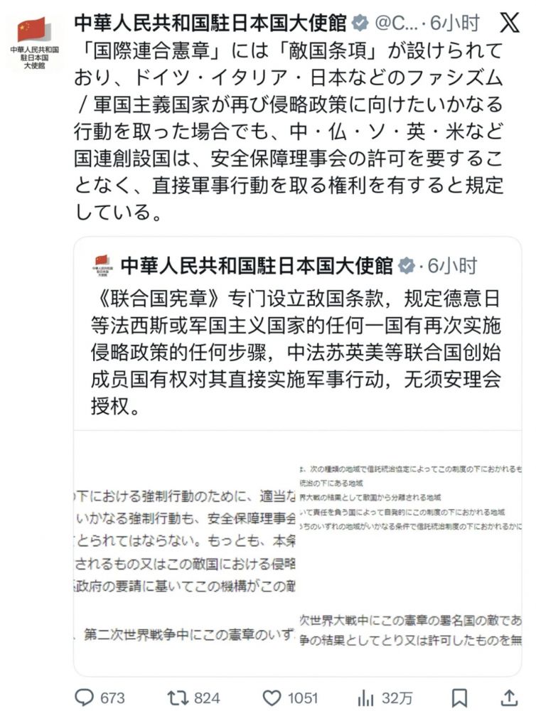 中国把联合国宪章搬出来当理由,呈现出对日本的赤裸裸的战争威胁。现在的问题不只是清华培养不了合格的领导人,中国的国际关系学院、北京大学、人民大学和复旦大学同样在培养外交官和国际关系理论人才方面存在着严重的短板。他们在审查历史文献时,忽略了一个关键因素——时间这个变量。把1945年的条款,毫无逻辑对应地拿来与2025年对照,这个错误特别离谱。很大可能是娘家河博士拿出来的方案,这样让中国的外交院校可以少背些锅。