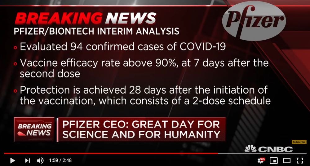美国制药巨头Pfizer(辉瑞)与德国生物制药公司BioNTech今天公布,他们联合研发的新冠疫苗的临床试验的良好结果超出预期。辉瑞希腊犹太裔总裁使用重口音说出这个消息时含着眼泪,他认为这是“科学和人类文明的伟大的一天“。普遍疫苗拥有50-70%的有效率就不错了,现在辉瑞疫苗的有效率是90%。