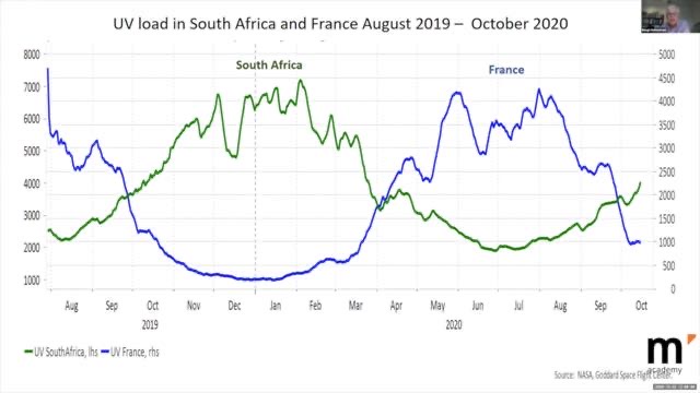 这个研究的核心结论是新冠感染呈现季节性,冬天相当严重,夏天则明显缓解,散漫的美国除外,美国如何有平线的日子也是高原中的平湖。他们认为,这些变化的原因是因为紫外线也是这样随季节变化的。紫外线辐射强的5-8月份新冠人数也下降,他们着重从法国的数据得出了这个结论。如果将这个观察放到南半球的南非或澳大利亚,他们的季节和紫外线照射刚好与我们北半球相反,他们的新冠病例的峰值则是出现在6-8月份,他们那时的紫外线也处于低谷。