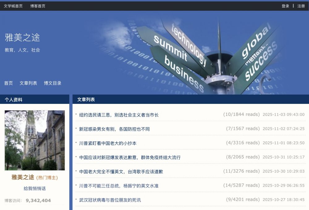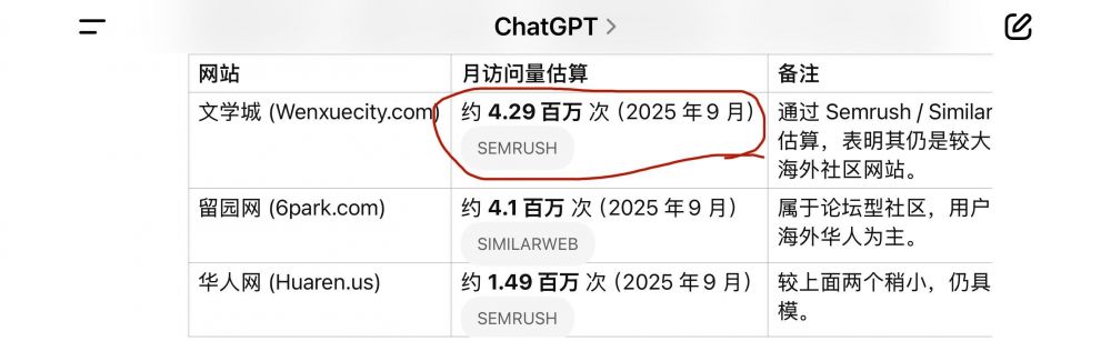 ChatGPT认为文学城在2025年9月的总访问量是429万次。我在同年的9月份在文学城发表了22篇文章,还是蛮多产的,总计72,728次阅读量,平均每篇3,305次阅读。也就是说我文章的总阅读量占文学城429万所有阅读量的1.69%,这是一个不错的占比。