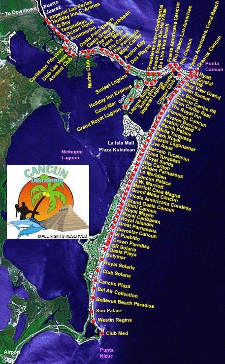 坎昆所在的位置本身就是一个天然海湾,因此成了旅游胜地。海湾内是一片平静的内海,外侧则隔着一道非常狭长的陆地,宽度大约只有五六百米,长度十几到二十几公里。在这条狭窄的陆地带上,密密麻麻分布着各种大型度假村。