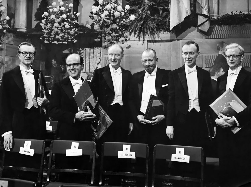 1962年诺贝尔奖得主,从左至右:Maurice Wilkins, Max Perutz, Francis Crick, John Steinbeck, James Watson和John C. Kendrew。