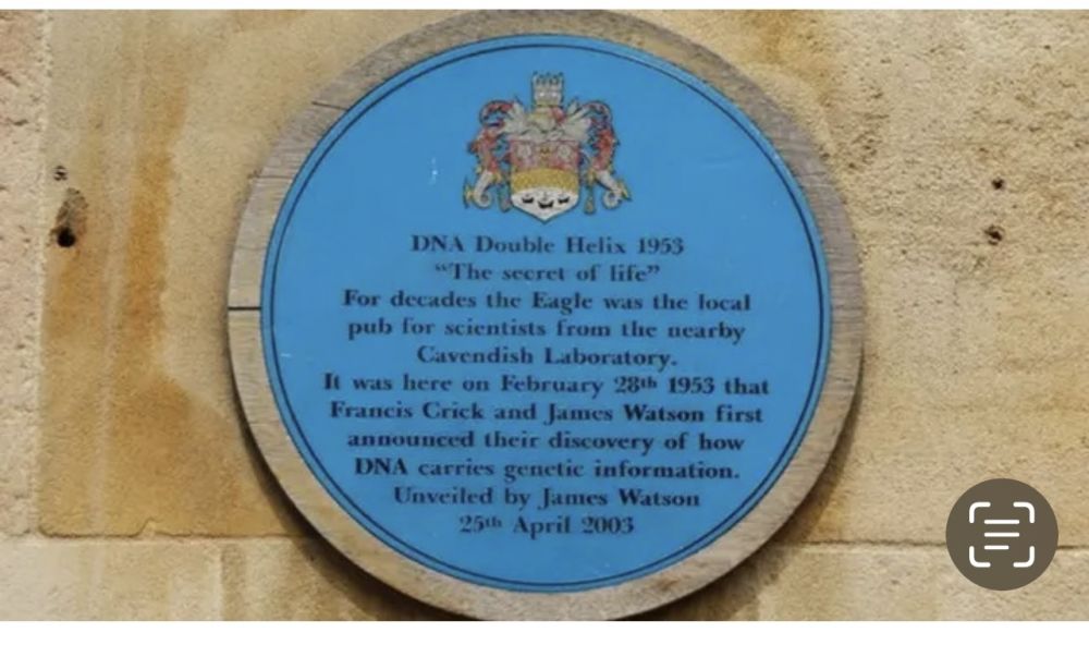现在剑桥著名的老鹰酒吧(Eagle)的外墙拥有一个牌扁标明,双螺旋结构是在那里公布的。我们可以看到真正出风头的是英国绅士Francis Crick, 而不是美国中西部牛仔James Watson: