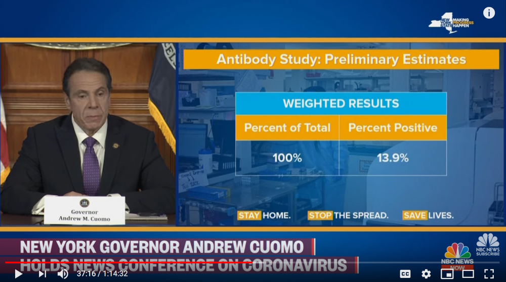 纽约州长Andrew Cuomo在今天的记者招待会上公布,他们在全州9个郡对40个杂货店等场所的3000人进行抽样抗体检测后发现,纽约全州可能13.9%的人口已经感染了新冠病毒。其中受灾最重的纽约市的21.2%人群呈现新冠抗体阳性,五人中就有一人多感染,这是难以置信的数据。富人区长岛和Westchester分别为16.7%和11.7%,纽约州的其他地方为3.6%。这些百分比与纽约州的人口分布也相似,因为乡下人口稀少,这是至今为止美国最大的新冠感染的人口调查。