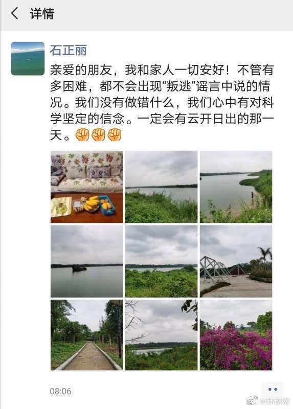 现在水落石出了,谣言不攻自破,石正丽再发一切安好的朋友圈:“亲爱的朋友,我和家人一切安好!不管有多困难,都不会出现‘叛逃’谣言中说的情况。我们没有做错什么,我们心中有对科学坚定的信念。一定会有云开日出的那一天”。