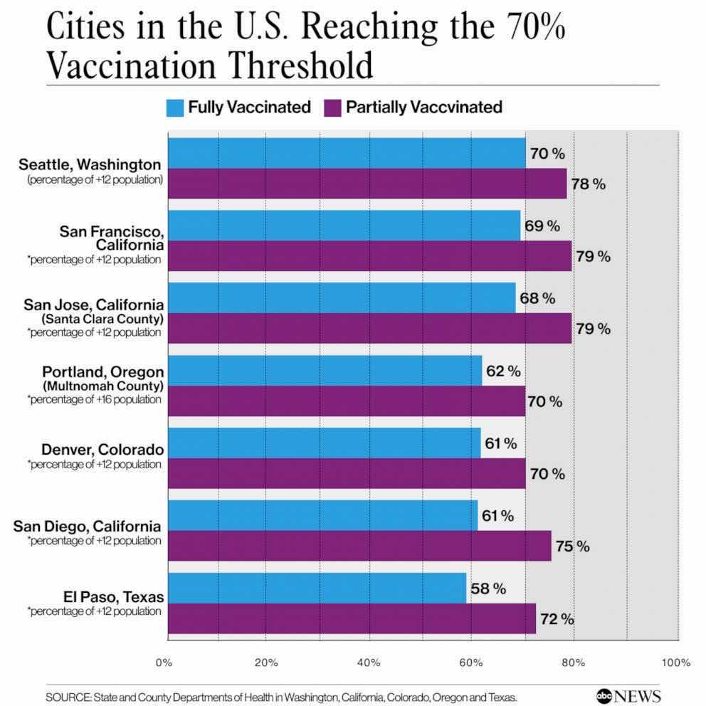 《美国哪些城市已经达到70%的疫苗接种率?》