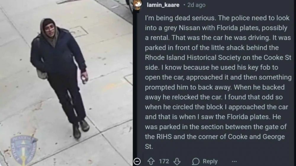 John的留言:“I'm being dead serious. The police need to look into a grey Nissan with Florida plates, possibly a rental. That was the car he was driving. It was parked in front of the little shack behind the Rhode Island Historical Society on the Cooke St side. I know because he used his key fob to open the car, approached it and then something prompted him to back away. When he backed away he relocked the car. I found that odd so when he circled the block I approached the car and that is when I saw the Florida plates. He was parked in the section between the gate of the RIHS and the corner of Cooke and George St.”