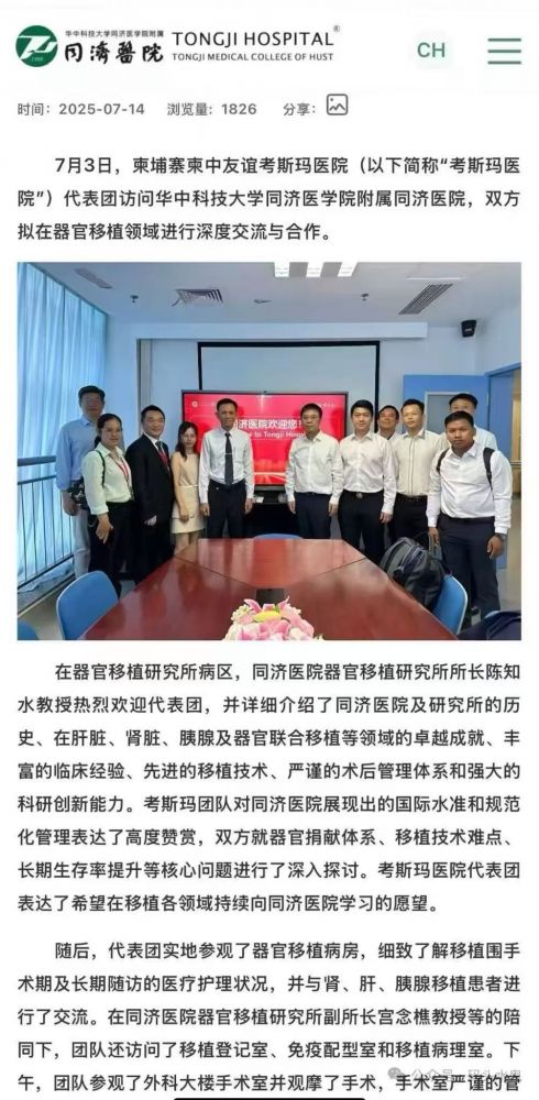 那么好的裘法祖创办夏穗生主导发展的同济器官移植研究所,我们那个时代长期为中国的领袖机构。现在衰败了,没有看见他们接见美国匹茨堡,MGH, NYU或WashU的这些顶尖移植中心的代表团,他们却与柬埔寨这种三流国家同流合污。柬埔寨以前有红色高棉杀害国家的几分之几的人口,现在是泰国与越南的邻国围攻天朝支持的柬埔赛的诈骗园区还有人体器官买卖市场。