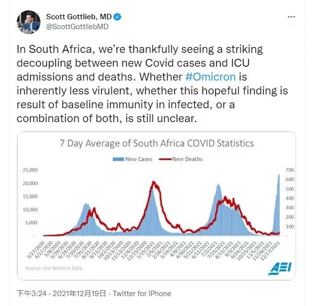 这个推特曲线来自美国FDA的前局长Scott Gottlieb医生,展现南非的新病例与死亡人数的曲线走向:一个向北,一个向南,呈现完全分离的走向。