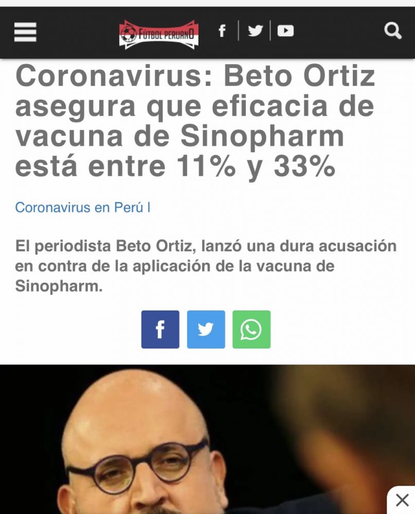 秘鲁记者Beto Ortiz向Willax电视台报道,国药武汉所疫苗的有效率为33.3%,国药北京所疫苗有效率为11.5%。但是负责临床试验的Coralith Garcia医生在秘鲁国会作证时说,国药北京所疫苗对保护重症和减少死亡相当有效。记者要求进一步采访她,她沒有回复。