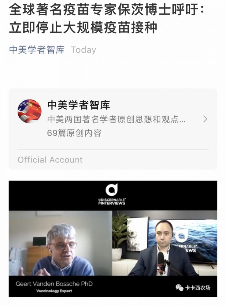 最近比利时人Geert Vanden Bossche建立网站,发布很少证据支持的科学手稿,他也接受采访,只传递一个信息:接种新冠疫苗将会为我们带来灾难性的后果。他还对世界卫生组织发表公开信,要求立即终止新冠疫苗的接种计划。