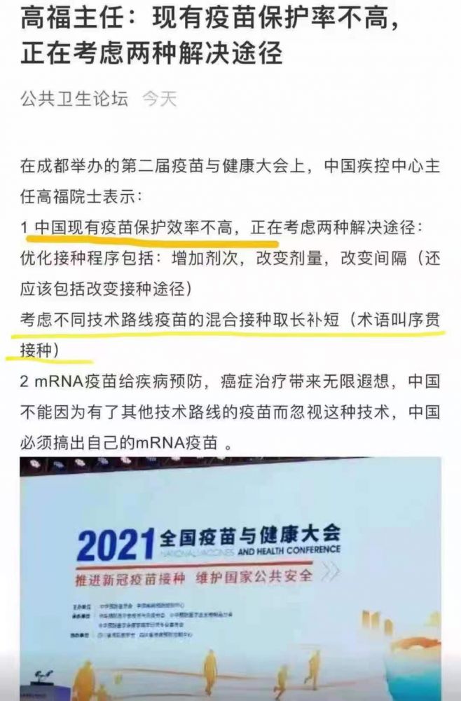 今晨当我看到中国疾控中心主任高福亲口承认中国疫苗不行后,写下这段留言:“这帮家伙终于在海外压力下改口了,承认自己疫苗不行,以前是神吹,代价是让我牺牲一个公众号,也值得。乔治高现在的策略也是乱投医,中国老百姓够喝几壶的,兽医把关,惨啊[Sob][Sob]”