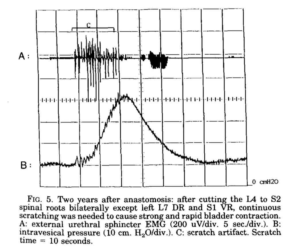 肖同学在30多年前,主要是通过功能实验核实他的创新手术,使用电生理检测神经元的功能和感应器测定膀胱的压力,以此证明体神经可以控制原来是自主神经掌控的膀胱平滑肌。他们也应用免疫组化实验证明神经元的延伸,可能也有电镜观察,文章里没说。