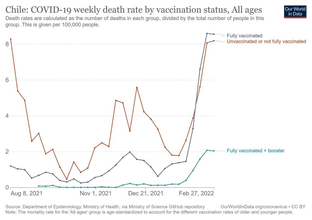 智利与中国同用灭活疫苗,这个曲线对中国有预警作用。曲线表示今春的奥米克戎死亡率创新高!不知道智利是否一直是开放社会,还是打了灭活疫苗后,提倡带口罩保持距离等物理防护?这对中国也有前车之鉴的指导意义”。