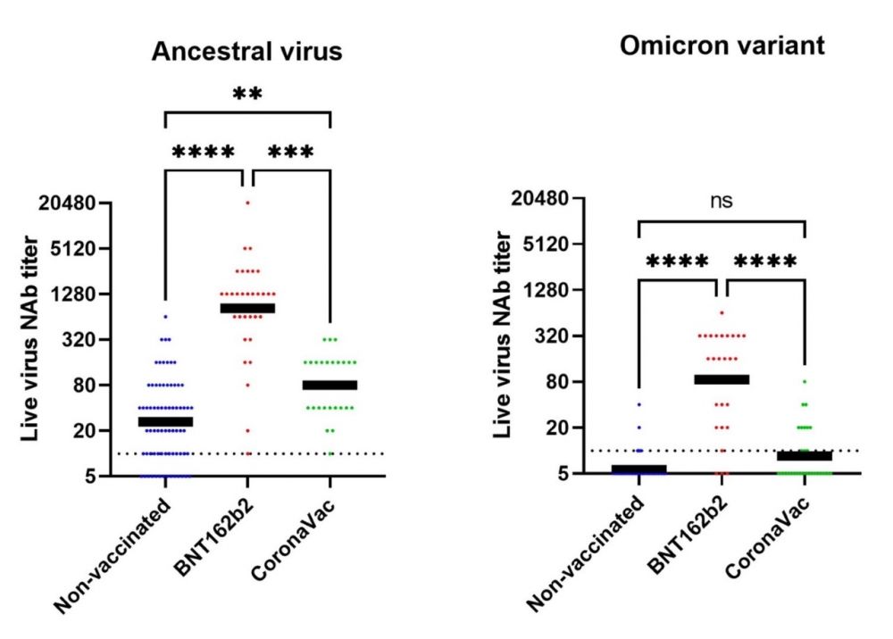 这里需要考虑免疫力随时间下降的问题,印象中美国和智利开始接种疫苗的时间相差不远。但是香港的实验证明,面对奥密克戎很多疫苗的效力都下降了,尤其以科兴降的明显,几个月之后几乎测不到科兴疫苗刺激产生的抗体。科兴刺激T细胞的效力也不行,所以凭这些结果很难想象任何科兴疫苗效果佳的报道。这也与香港在80岁以上疫苗保护力的数据相符,完成两针科兴的死亡率是两针复必泰的大约一倍。