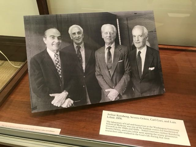 这是一张陈列在圣路易斯华盛顿大学医学院图书馆的科学同行的合影,四位全部是诺贝尔奖得主。他们里面包括现代生物医学领域家喻户晓的人物,也让我想起他们那些改变人类科学走向的发现,像斯坦福大学教授Arthur Kornberg和他发现的DNA聚合酶。但是这远非一张简单记录诺贝尔奖获得者聚会的照片,因为这四位还加上另外的四位诺贝尔奖得主全部出自同一个实验室:圣路易斯华盛顿大学的Cori实验室,位于照片右手第二的长者Carl Cori(卡尔·科瑞)和他太太Gerty Cori (戈蒂·科瑞)曾经是那个实验室的主人,美国中西部的圣路易斯曾经是研究代谢和生物化学的麦加。