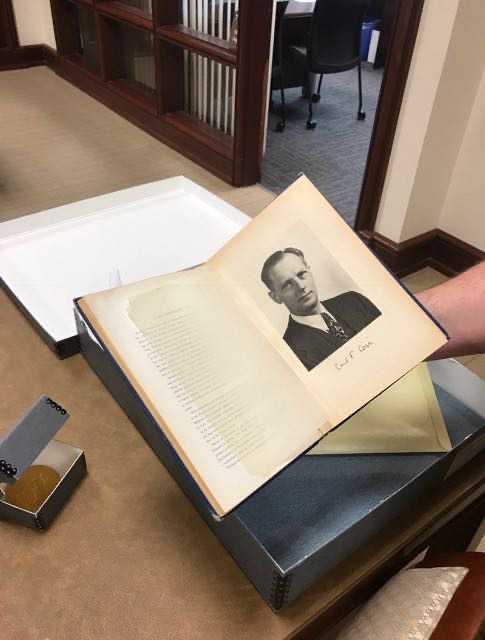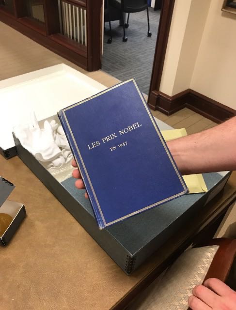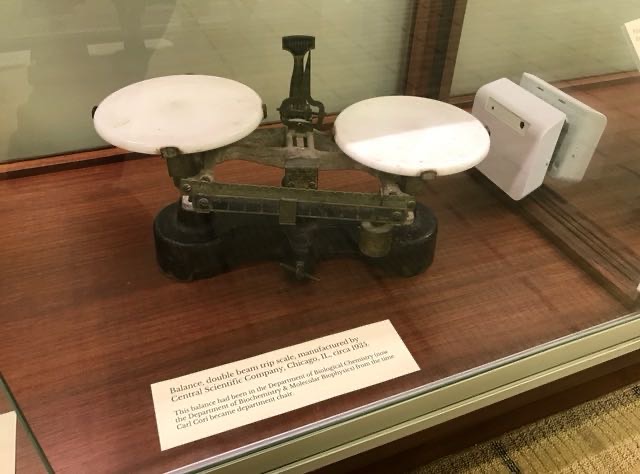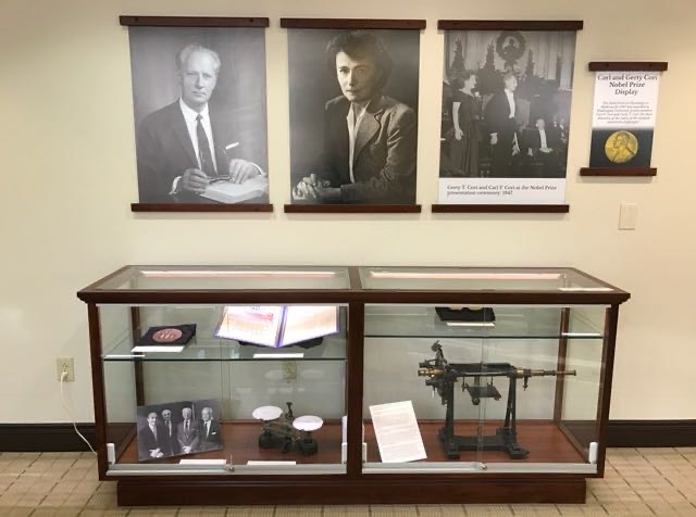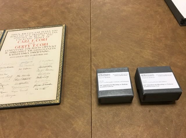 在医学院图书馆六楼的医学历史研究中心外,有个介绍科瑞夫妇的墙面和展柜,存有不少照片和实验室仪器,还有诺贝尔奖章和证书,但是那里特意说明奖章和证书都是复制品,真正的东西在七楼的稀有图书室里。我就再上了一层楼,看见展室深处的办公室有位先生在里面。我敲门进去,自我介绍并说明来意后,他即带上手套相当专业地为我展示了这些历史文物级的珍品。他打开桌上装有科瑞诺贝尔奖的小方盆,首先向我解释为什么使用四个小方盆去装两枚诺贝尔奖章,原来除了两枚科瑞儿子赠给的真的诺贝尔奖章外,另外两枚是卡尔·科瑞的第二任太太赠予的复制件。戈蒂在获诺贝尔奖的同年被诊断患有一种罕见的血液疾病(骨髓纤维化),十年后于1957年去世,享年61岁。卡尔在华大工作到1966年退休,35年的华大岁月。卡尔在戈蒂病逝后何时再婚的不清楚,他退休后作为访问教授在哈佛一直工作到生命最后的1984年,以87岁高龄逝世。