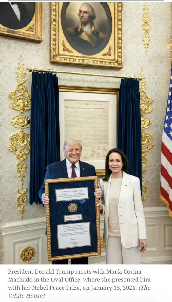 委内瑞拉反对派领袖和今年的诺贝尔奖和平奖得主马查多女士,昨天在白宫与川普举行了会晤。她将诺贝尔奖章装裱后配上赞美文字赠送给了川普总统,川普也高兴地接受了。