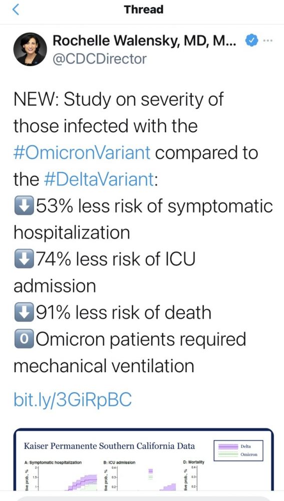 这是来自圣路易斯华大校友和CDC主任Walensky的推特,她转发和认可了昨天的报告。这是南加州科学家对53000名病例的研究,他们直接比较奥密克戎和Delta突变株感染后发现奥密克戎可以导致:
