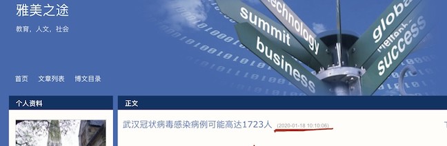 在这里也回复朋友的这个问题:“朋友问:“请将您2020年1月18日腾讯删掉的文章发来,谢谢您!”。每年1月18日对我来说是个特殊的日子,因为我在当天的博文救了不少武汉乡亲的生命。今天正好有朋友问起,我就重新放上在自由世界保存的版本。他们删的时候己经在公号里阅读了一万三千多次,大家才开始警惕起来。我是正式以文章的形式最早向武汉预警的海外人士之一,在官方说可防可控,万人宴和春节团拜会的时候,我说有1700人感染。我当时觉得做了应该做的事情,现在看来应该感谢自己听了不少贝多芬的《英雄交响曲》。