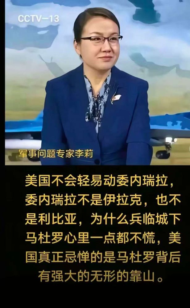 这是李莉评论委内瑞拉的言论:“美国不会轻易动委内瑞拉,委内瑞拉不是伊拉克,也不是利比亚,为什么兵临城下马杜罗心里一点都不慌,美国真正忌惮的是马杜罗背后有强大的无形的靠山。马杜罗不慌,委内瑞拉军事实力不弱!”。