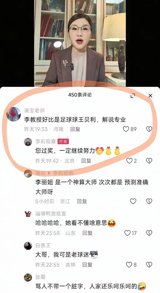 更为可笑的是,李莉教授对社交媒体的基本语境都缺乏理解。有读者恭维但是实则讽刺地评论她:“李教授好比是足球球王贝利,解说专业”。李莉显然没看懂这句话的真正含义,还一本正经地回复:“您过奖,一定继续努力”。言下之意,仿佛类比她像球王就是高度赞扬,她可能只知道贝利是球王。