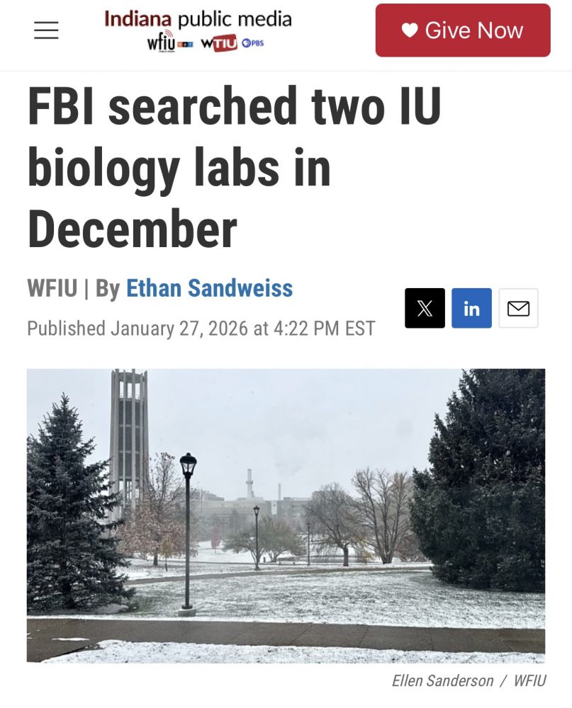 我知道这消息比较晚:印第安纳大学布卢明顿分校(IU Bloomington)生物系的两个实验室,在一个多月前遭到美国FBI的搜查。