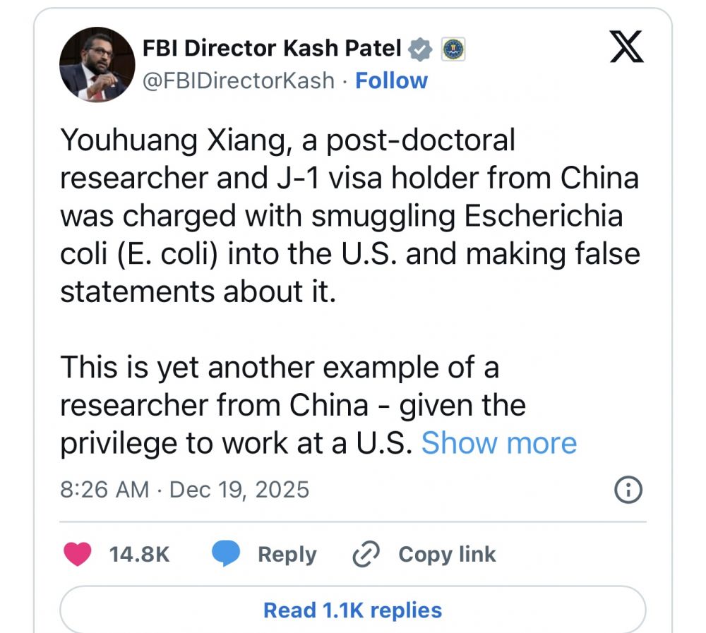 FBI给出的搜查理由,是一名中国籍博士后从中国带来了用于基因表达的质粒。更令人错愕的是,川普的印度裔FBI局长还刻意强调,这是一种来自大肠杆菌的物品,几乎可以肯定他是在对公众进行某种恐吓式的宣传。