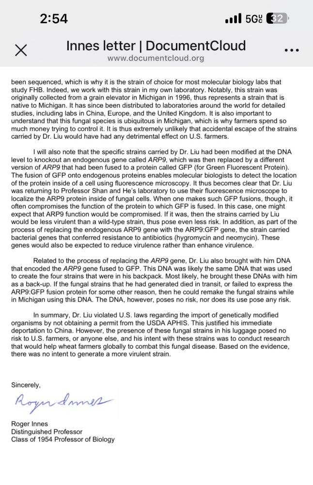 “In summary, Dr. Liu violated U.S. laws regarding the import of genetically modified organisms by not obtaining a permit from the USDA APHIS. This justified his immediate deportation to China. However, the presence of these fungal strains in his luggage posed no risk to U.S. farmers, or anyone else, and his intent with these strains was to conduct research that would help wheat farmers globally to combat this fungal disease. Based on the evidence, there was no intent to generate a more virulent strain.”