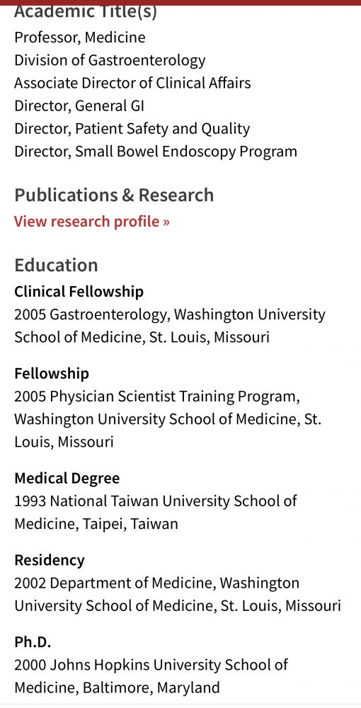因为操作十分顺利,我在就医后再去看陈医生的网上履历,他还是在Johns Hopkins拿的PhD, 文章发表在Cell上。随后在WashU做完住院医和消化科专科训练,现在是WashU消化科的正教授,他真是了不起的华裔医生,非常值得信赖。