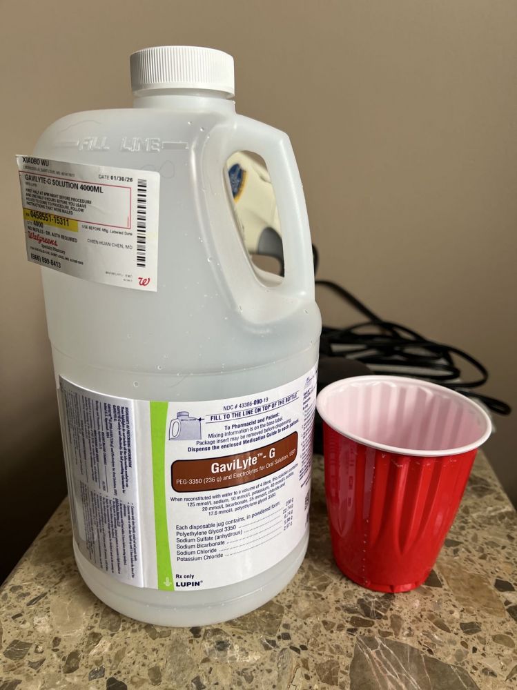由于我预约的检查时间是早上 8:15,两次各 2000 毫升,第一次从晚上6点开始喝,第二次则是在清晨4点进行。按照要求,每 15 分钟喝一杯。大约在第三杯即40 分钟后,肠道开始排空:起初还有固体残留,随后基本只剩液体。