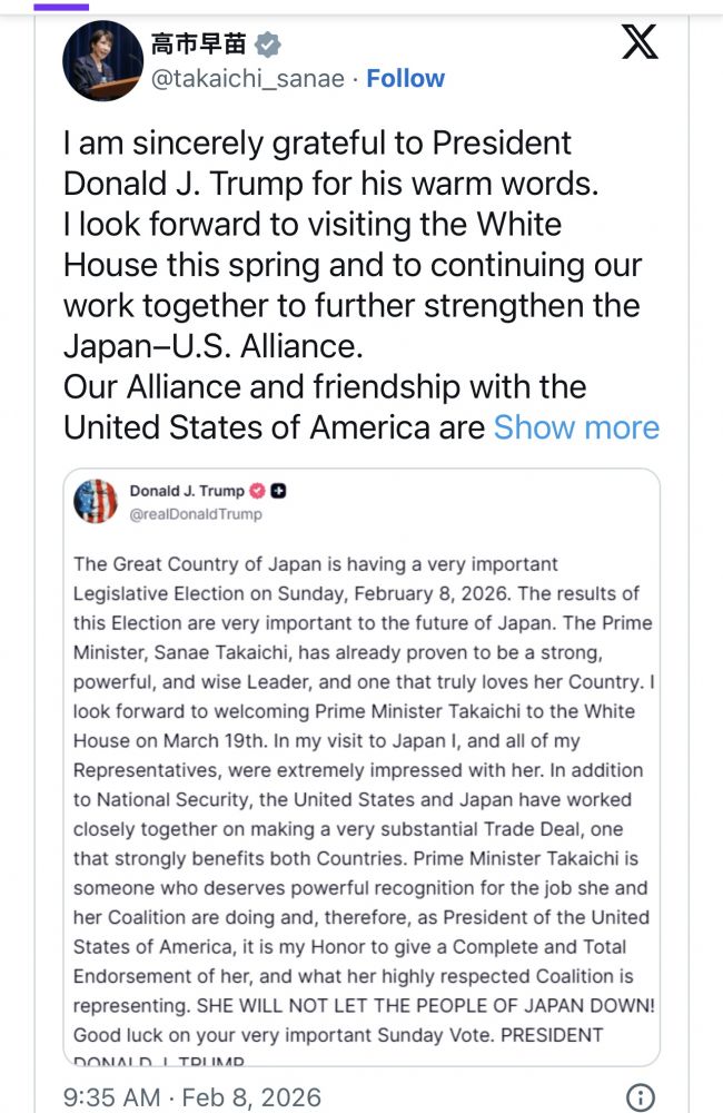 川普于今天在社交媒体发文祝贺高市早苗的选举胜利,高市早苗也这样回推和确认3月19日的访美行程:“日美同盟與兩國間的友好關係,是建立在深厚的信任以及緊密穩固的合作基礎之上。我們的同盟潛力無限。讓我們攜手合作,確保日美同盟能持續為兩國及世界帶來和平與繁榮。”