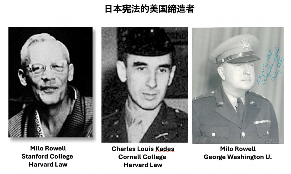 为此,他动员了几位在美军服役、但具有系统美国法学训练背景的年轻法律人员。这些人中,有的毕业于斯坦福或康乃尔本科,两位是哈佛法学院毕业生,有位军官毕业于乔治华盛顿大学法学院,他们本质上都是接受过美国宪政制度与法律工程训练的专业人士。因为他们并非日本问题专家,所以将熟悉的美国式宪政模板直接应用到了日本。
