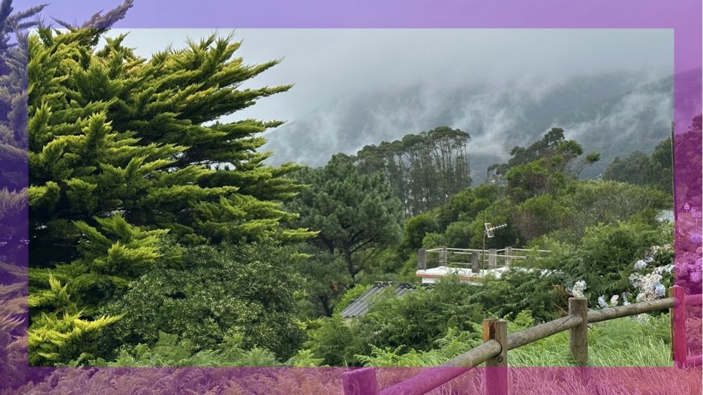 前方,是一片蓊郁的群山,在蒙蒙雨帘下仿佛披上了层层蝉翼般的白纱。我们在如诗又如梦的纱帐里绕来绕去,山林茂密寂静,道路崎岖陡峭,我专心探路,竟然忘了用手机东拍西照。花了近一个半小时,总算从山的这头到达了山的那头,并且还神奇地绕过了A Guarda, 回归“正路”。我开玩笑地对LD讲,“刚才的山路,你觉得,A Guarda村里有几个村民走过呢?”
