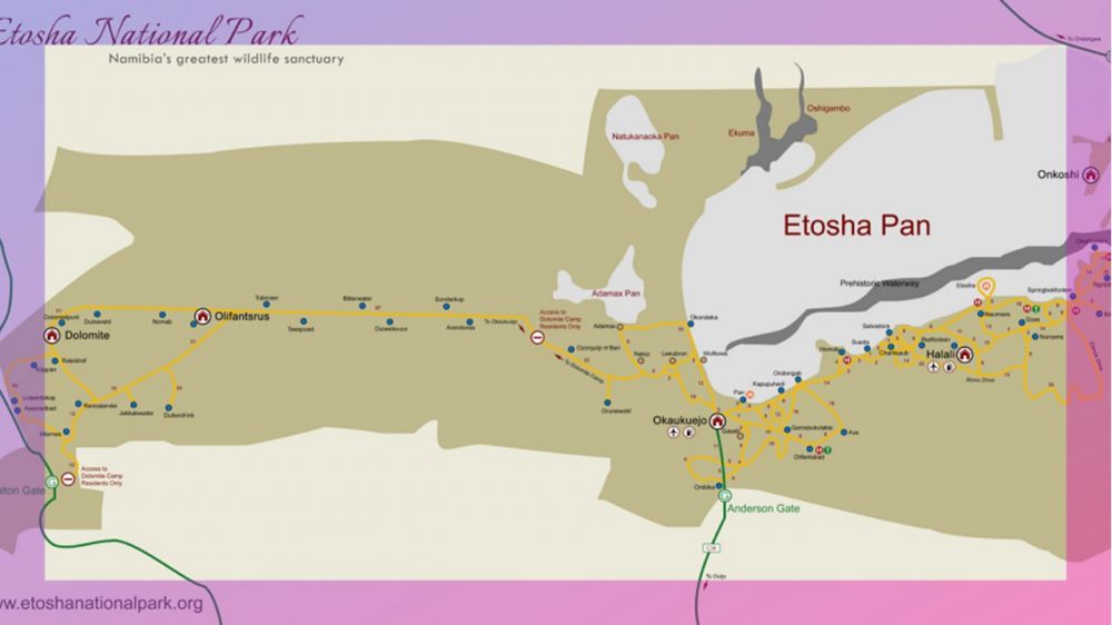 埃托沙国家公园始建于1907年的德国殖民时期,最初面积达10万平方公里,当时是世界上最大的野生动物保护区。如今的面积虽缩小了4-5倍,它依然是非洲最非凡的野生动物保护区之一,是世界上唯一的沙漠地形野生动物栖息地。埃托沙意为“白色干水之地”,“白色”是指那一望无际(4,800平方公里)的盐沼地-Etosha Pan,在旱季因缺水而呈现的颜色。