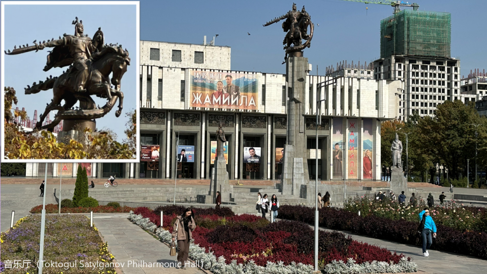 下中:在国家历史博物馆前的广场上,矗立着吉国的核心人物雕像。此“大人物”几经更迭,从列宁雕像(1984)-自由女神雕像(2003)-玛纳斯雕像(Aikol Manas, 2011)-新玛纳斯雕像(2025),反映出历史翻篇的速度。我们的步伐够快,见到了才问世两个半月的新雕像,你从网上恐怕是查不到的。