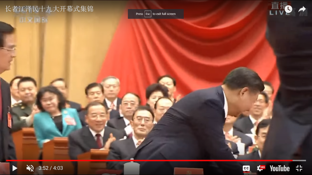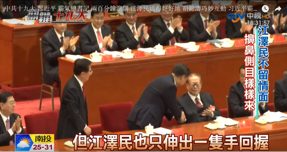 最近十九大开幕式,习核心做完历史最长报告后回到座位上,先和站起来的胡哥握手,然后伸出双手和江核心握手,结果现场直播这一双核握手的历史镜头竟然被一位摄影记者挡住了。央视其后并未修改这一镜头(截屏如下),引发了种种猜测。有人说这是警告老江甚至要对他动手的信号。实际如何呢?
