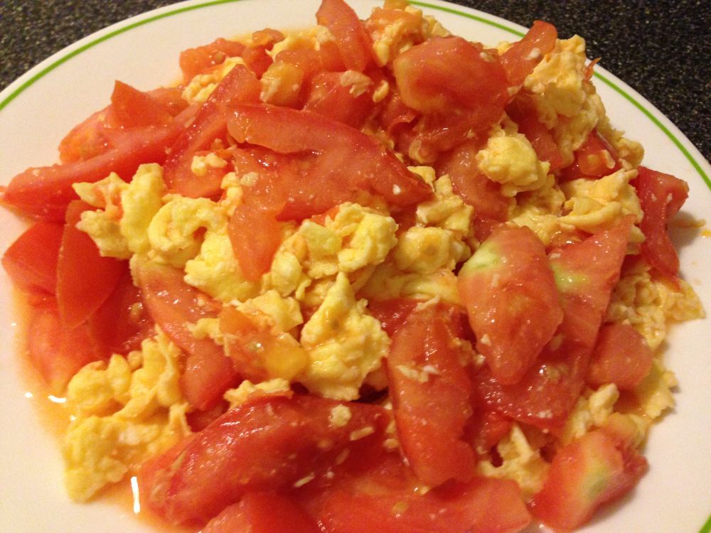 西红柿炒鸡蛋:中国人都会做的菜,无它,鸡蛋要足量而已。一次做给美国同事吃,人家认为是早餐!太不能体会中国饮食文化的博大精深了。什么早餐晚餐,好吃的就是美餐!