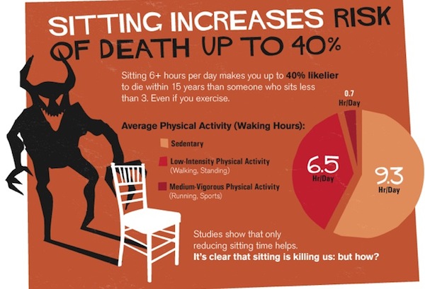虽然我没有具体地研究过,但是却也听说过长时间的伏案和保持静坐的姿势对健康不利。就常理来说,长时期地保持静坐,肯定不利于血液循环。特别是在餐后,更不利于消化,容易造成小腹肿胀。如果不注意坐姿,容易造成劲椎疲劳和肌肉劳损。特别是对于办公室白领丽人来说,容易造成让美女变色的越坐越宽,脂肪囤积,身材走样。我个人来说,有时候虽然提醒自己要适当地注意调节姿势,或者走一走,但是工作一专注起来,几个小时不挪窝也是常有的事。