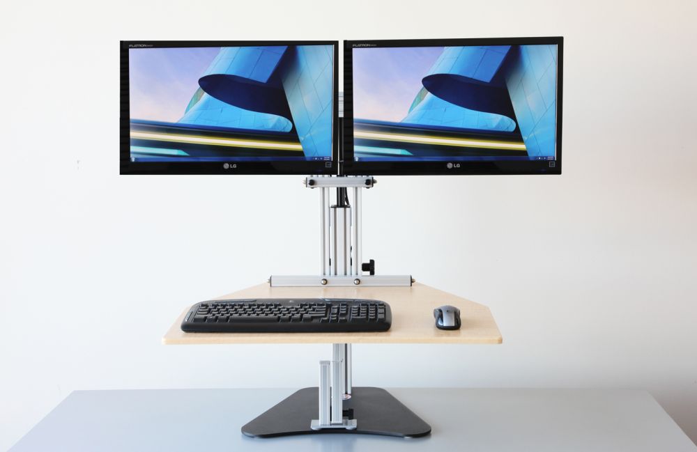 以下是网络图片。我的桌子的设置跟它差不多。中间那个放键盘的小平台和电脑显示频都是可以在主支撑架上移动的,方便在站立和坐下之间转换。