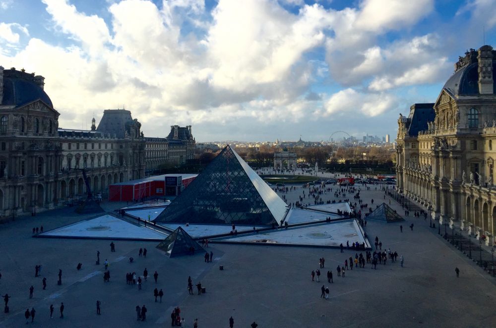 卢浮宫入口就是由著名的华裔设计师贝聿铭设计的卢浮宫金字塔。这个金字塔由玻璃和金属制造,极富现代感,坐落在古香古色的拿破仑庭院中,显得十分别致。支持者认为是现代与历史艺术的完美结合,反对者认为在古典庄严中不伦不类的“eyesore” 或者是”巴黎的伤疤“。尽管重口难调,但它确实非常实用地解决了罗浮宫旧有的入口无法容纳大量的人流量的问题,并且完美地通过玻璃引入了大量的自然光线,我认为它是成功和美丽的。自从我看了《达芬奇密码》这本小说之后,一直对这个金字塔和卢浮宫念念不忘,如今亲临实地,似乎有如兰登教授追寻解密”圣杯“谜题之感。难道这个金字塔底下真的埋藏着抹大拉的馬利亞的灵柩吗?
