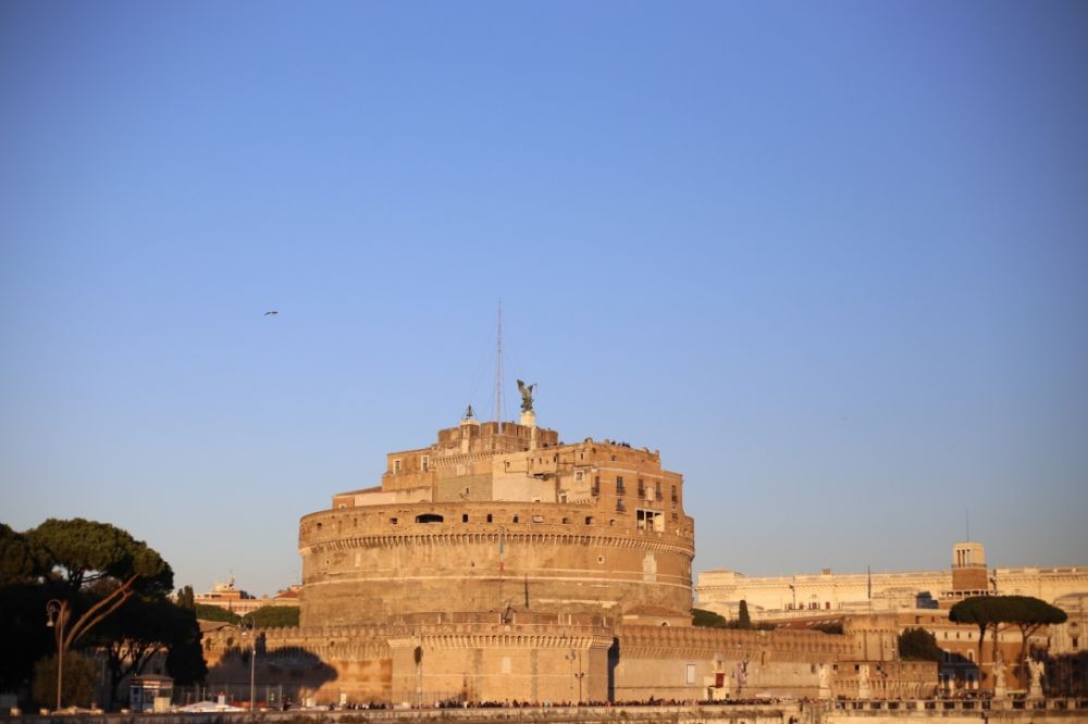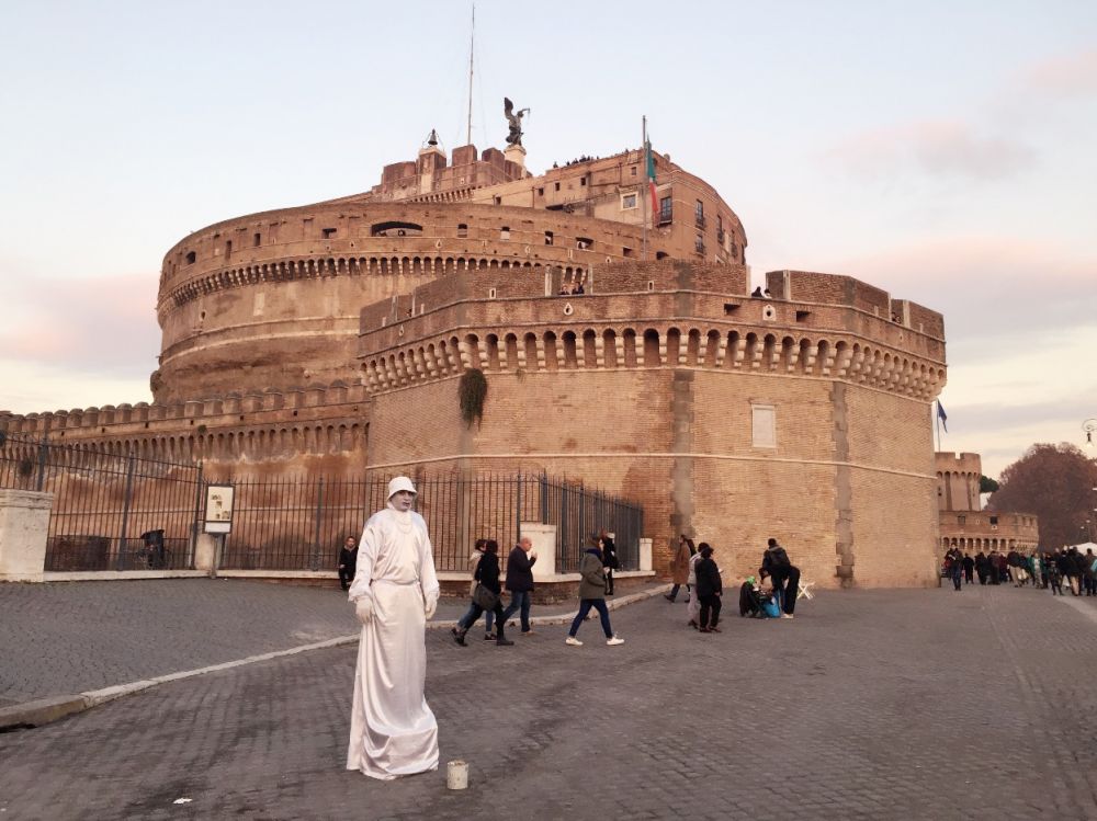 圣天使城堡 (Castel Sant'Angelo)和在城堡前卖艺的雕像艺人。城堡里面可以看到曾经作为防御工事的各种巧妙机关。