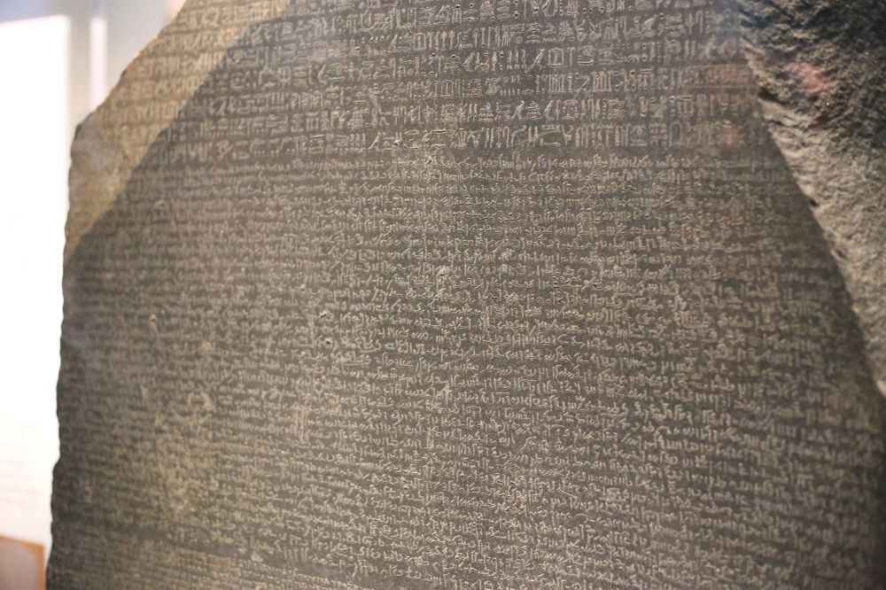 罗塞塔石碑 (Rosetta Stone):高1.14米,宽0.73米,制作于公元前196年,刻有埃及国王托勒密五世诏书。石碑上用希腊文字、古埃及文字和当时的通俗体文字刻了同样的内容,这使得近代的考古学家得以有机会对照各语言版本的内容后,解读出已经失传千余年的埃及象形文之意义与结构,而成为今日研究古埃及历史的重要里程碑。