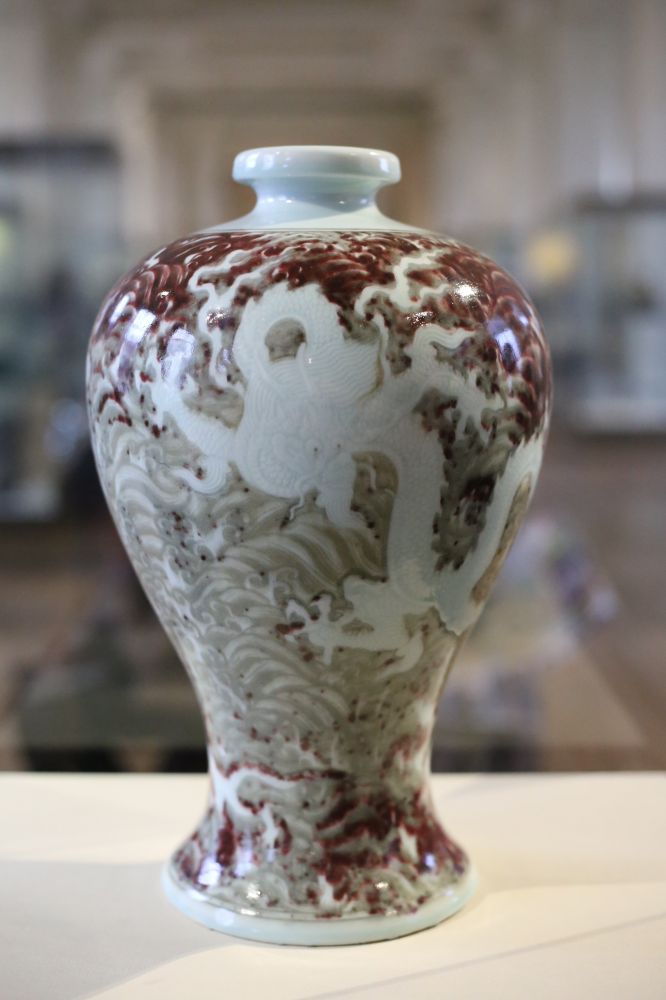 我很喜欢的一件瓷器,永乐釉里红海水龙纹梅瓶。白龙张牙舞爪,红海水火焰滔天,我觉得它很写意别致。