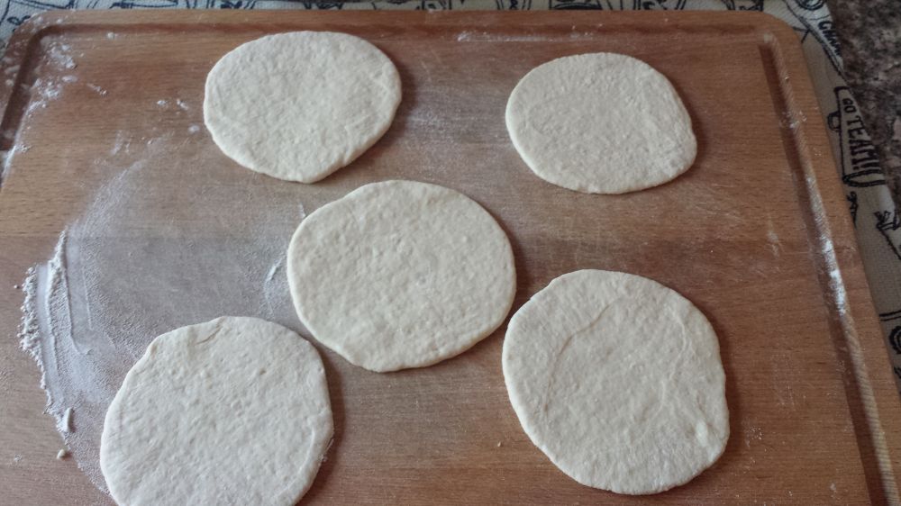 5 烙饼:平底炒瓢预热,中等偏下的火(3-4档),把饼放入,不加油烤,等到上面鼓起时就翻饼,翻过后,用铲子压一压,让尽可能大的面接触炒瓢,烤到微黄时拿出。