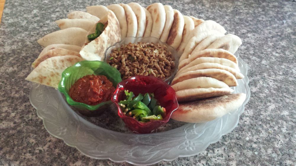 7 然后往饼口袋里填肉,加青辣椒,辣椒酱(根据个人口味)。