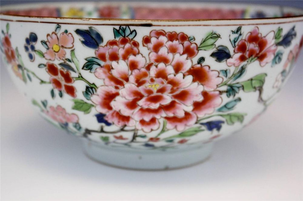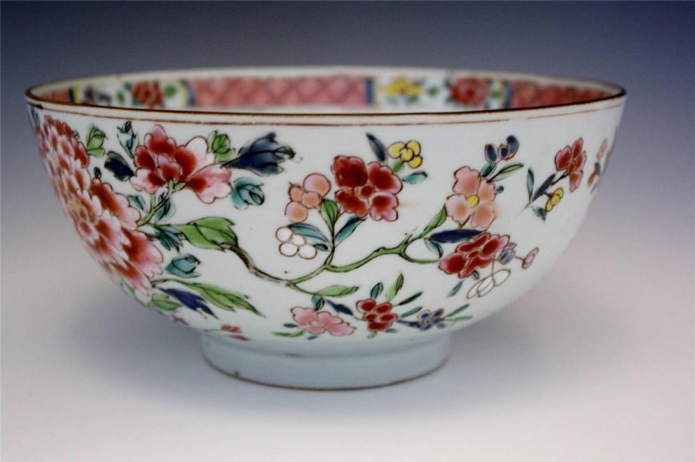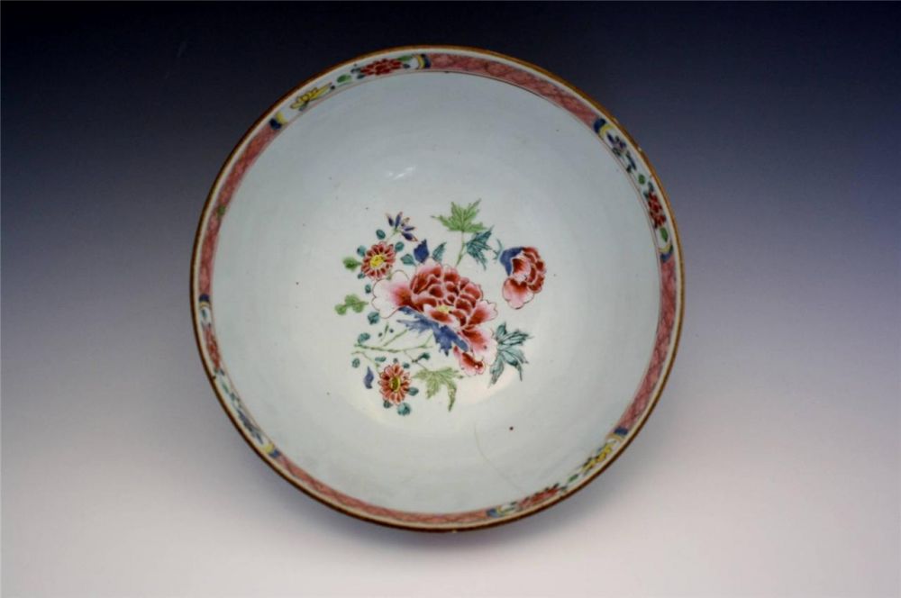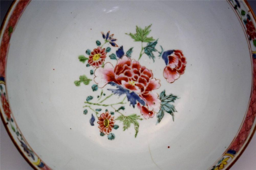 从此碗的特点和一些类似的碗比较,这应该是一件雍正(1723-1735)或乾隆早期(1735-1795)的白地粉彩双犄牡丹花卉纹碗,为保守一些,个人倾向于清乾隆早期年间(1735-1795)。直径20厘米,内外均手绘花枝,色彩鲜艳,画质精美,不惜笔墨。所以从这件瓷器的年代来看,与埃文斯牧师的生平非常吻合。埃文斯牧师生于1747年,如果这件瓷器在雍正时期(1723-1735)制作的话,最早可能造于1723年,那就是说这件瓷器可能顶多在他出生前24年就存在了,或如果造于乾隆早期(1735-1795)那他十岁左右时就可能已经存在了。根据以"双犄牡丹"为证, 应定雍正, 因为纹饰理论上讲,"双犄牡丹"乾隆朝已绝迹。虽然康熙朝"双犄牡丹"盛行, 但直到康熙快结束时才有釉上青花.。雍正一朝多染胭脂气, 总体特怔符合。